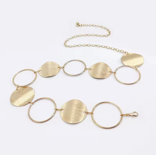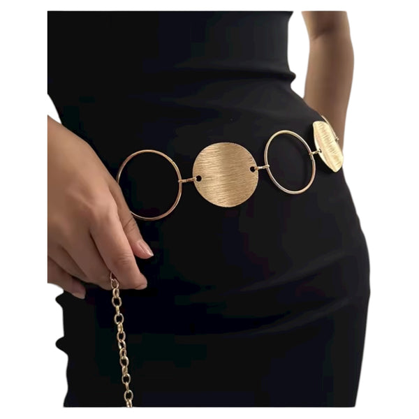 Diseño moderno y minimalista que marca presencia. Este cinto de 1,15 m de largo y 6 cm de ancho combina discos metálicos texturados con anillos abiertos, creando un ritmo visual elegante y contemporáneo. Ideal para elevar cualquier outfit con un toque de sofisticación urbana.
