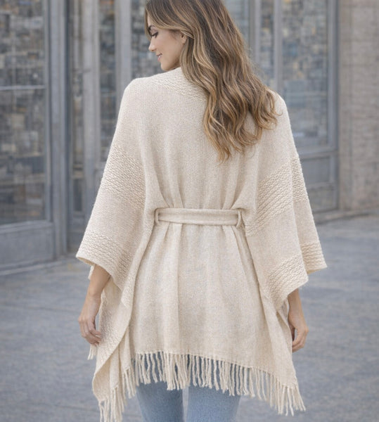 Hermosa ruana de tejido suave y abrigado, ideal para los días frescos. Su diseño amplio y cómodo permite usarla de forma suelta o ajustarla con su delicado lazo del mismo material, logrando un look elegante y práctico. Terminación con flecos que le aportan un toque moderno y sofisticado.