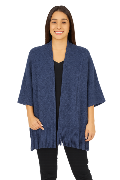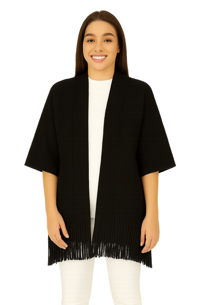Prenda confeccionada en suave lana de excelente calidad. Su diseño tipo kimono ofrece comodidad y estilo, ideal para usar sobre cualquier look, aportando abrigo y un toque elegante.